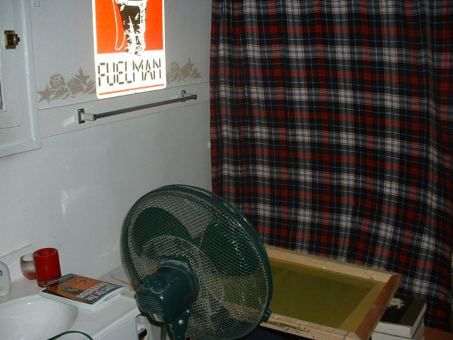 to help seal off the edge of your screen (FIG. M). This will just make things easier when you print (i.e. ink won't be collecting under the wood pieces etc.) and will also cover up pinholes and other unwanted holes in the emulsion. If you see little see-through areas that aren't supposed to be see-through, you can use little pieces of tape to cover those up too. Okay, now you're ready to print. You'll need to buy a squeegee ($8 - $15) and whatever color of inks you want ($6 - $8 a jar). And of course the paper you want to print on. It's pretty easy to figure out from here: You position your paper beneath your screenÑuse marks on the table, or pieces of tape so that you're printing at the same place on each sheet of paper. In this pic I taped the acetate to my paper to give me a better idea of exactly where I wanted the screen to go on top of it (FIG. N). You may want to set up kind of a 'hinge' system for your screen, so that you can raise and lower it to the exact same place everytime. I have actual metal hinges, but I used to just put a few strips of duct tape along the back part of the frame for sort of a 'poor-man's' hinge system (FIG. O). Okay, once you've got your registration figured out, it's ready to squeegee. Dallop a bead of ink along an edge of your artwork (FIG. P). And then drag the squeegee along the artwork (FIG. Q): There are differing opinions on squeegee technique; you really just have to figure out what works best for you. I usually do a couple of swipes, just to make sure I get all the areas heavily inked. But they're pretty quick swipes, as to not gunk too much ink on the paper. Lift up the screen, pull your print out, align a fresh sheet underneath of there, and do it again! I use the Speedball inks (everything I describe in this process is water-based for easy clean-up), which take 15 or 20 minutes to dry. I end up laying prints all around my apartment while they're drying (FIG. R): If you're doing multi-color prints, do it all over again! Clean everything up, and start over. Warning: registration will be even more important this time! Final print is (FIG. S). Total cost for step 6: $25 Sorry for the rambling. I hope some of this helps! It looks like the total cost comes out to $80 - $100, but a lot of this stuff lasts for a really long time, especially the screen, lightbulb, and squeegee. You'll eventually run out of the chemicals and inks, but you'll be able to do several editions of prints out of them. It will take some time and effort but hopefully will be rewarding. |