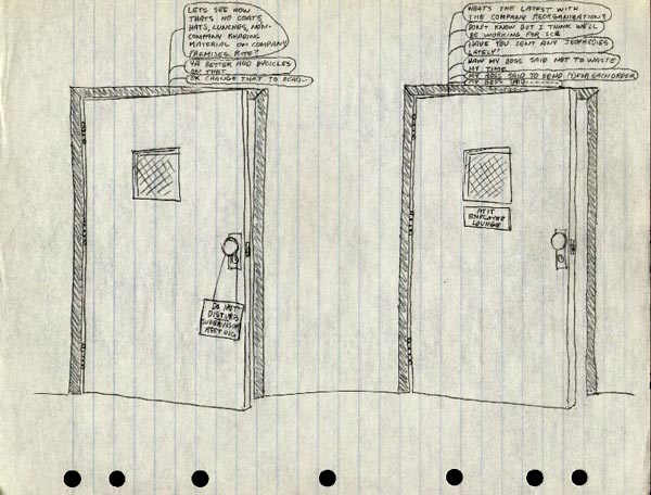 the AT&T EMPLOYEE LOUNGE: "What's the latest with the company reorganization?" "Don't know but I think we'll be working for SCB" "Have you sent any jeopardies lately?" "Naw, my boss said not to waste my time" "My boss said to send 3 for each order" "My boss said..." |