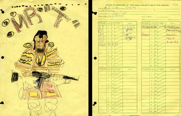 | Text on the back indicates that this drawing was done on March 20, 1983. Toots would've been 33 and Dan would've been age 5. We're still waiting to hear what a "Mazooka" is. |