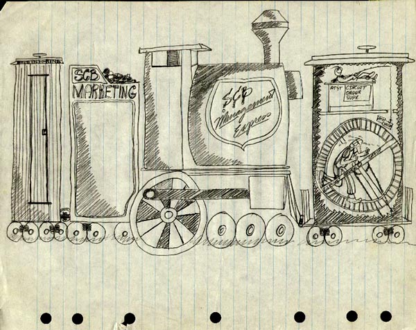 | The fellow at the AT&T Circuit Order Supervisor desk is holding a fishing pole with an AT&T check dangling in front of it. The hamster wheel is labed "Circuit Order Group". Touché! |