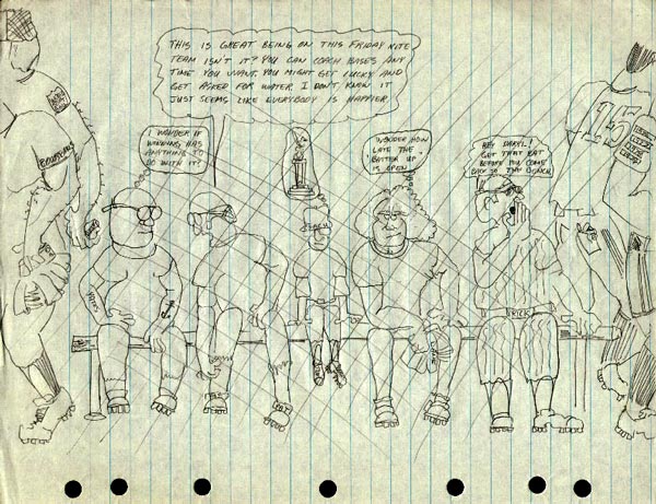 | "This is great being on the Friday nite team isn't it? You can coach bases any time you want. You might get lucky and get asked for water. I don't know it just seems like everybody is happier." "I wonder if winning has anything to do with it?" "Wonder how late the 'Batter Up' is open?" "Hey Darryl! Get that bat before you come back to the bench!" |