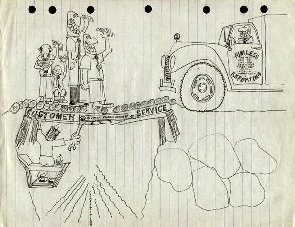 | The bracket holding the bridge together is labeled "Direct Problem Solving", the fellow with the wrench has a toolbox labeled "tech", and the river below is "competition". |