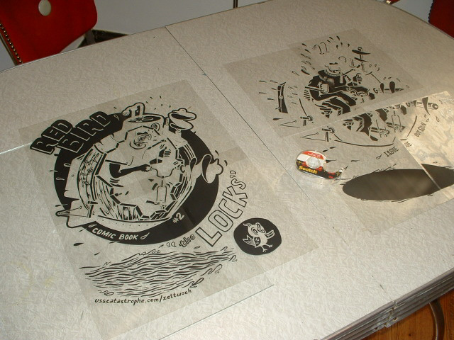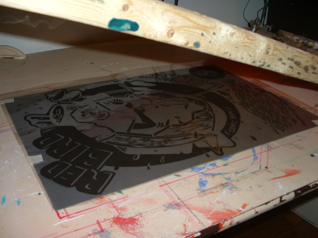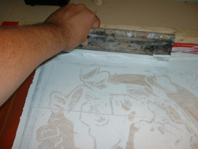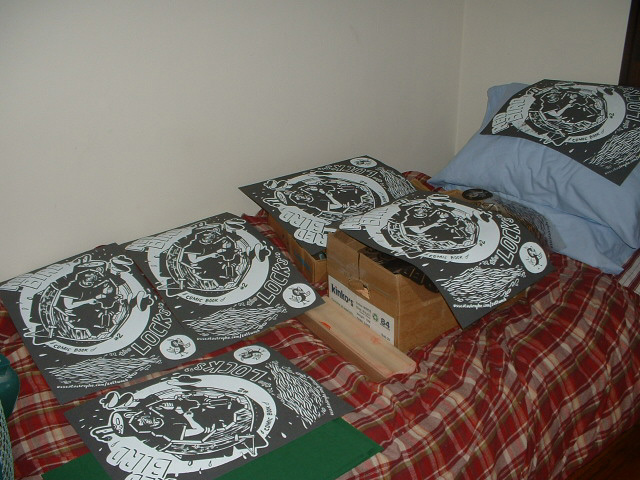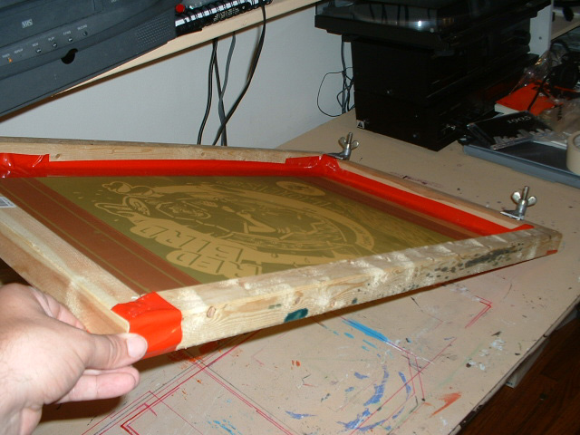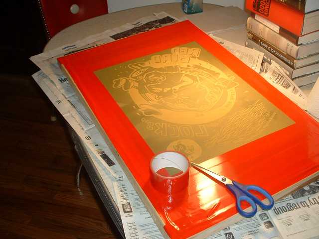 to help seal off the edge of your screen (FIG. M). This will just make things easier when you print (i.e. ink won't be collecting under the wood pieces etc.) and will also cover up pinholes and other unwanted holes in the emulsion. If you see little see-through areas that aren't supposed to be see-through, you can use little pieces of tape to cover those up too. Okay, now you're ready to print. You'll need to buy a squeegee ($8 - $15) and whatever color of inks you want ($6 - $8 a jar). And of course the paper you want to print on. It's pretty easy to figure out from here: You position your paper beneath your screenÑuse marks on the table, or pieces of tape so that you're printing at the same place on each sheet of paper. In this pic I taped the acetate to my paper to give me a better idea of exactly where I wanted the screen to go on top of it (FIG. N). You may want to set up kind of a 'hinge' system for your screen, so that you can raise and lower it to the exact same place everytime. I have actual metal hinges, but I used to just put a few strips of duct tape along the back part of the frame for sort of a 'poor-man's' hinge system (FIG. O). Okay, once you've got your registration figured out, it's ready to squeegee. Dallop a bead of ink along an edge of your artwork (FIG. P). And then drag the squeegee along the artwork (FIG. Q): There are differing opinions on squeegee technique; you really just have to figure out what works best for you. I usually do a couple of swipes, just to make sure I get all the areas heavily inked. But they're pretty quick swipes, as to not gunk too much ink on the paper. Lift up the screen, pull your print out, align a fresh sheet underneath of there, and do it again! I use the Speedball inks (everything I describe in this process is water-based for easy clean-up), which take 15 or 20 minutes to dry. I end up laying prints all around my apartment while they're drying (FIG. R): If you're doing multi-color prints, do it all over again! Clean everything up, and start over. Warning: registration will be even more important this time! Final print is (FIG. S). Total cost for step 6: $25 Sorry for the rambling. I hope some of this helps! It looks like the total cost comes out to $80 - $100, but a lot of this stuff lasts for a really long time, especially the screen, lightbulb, and squeegee. You'll eventually run out of the chemicals and inks, but you'll be able to do several editions of prints out of them. It will take some time and effort but hopefully will be rewarding. |