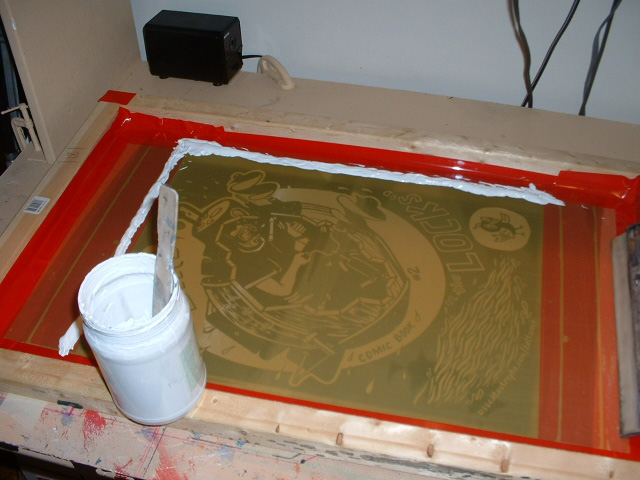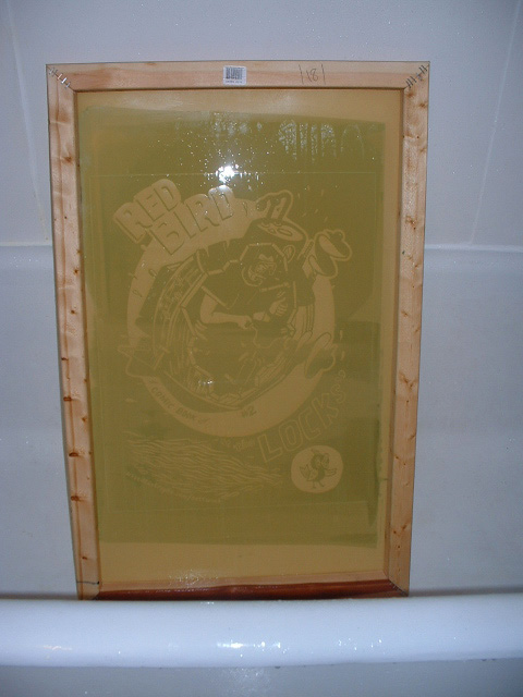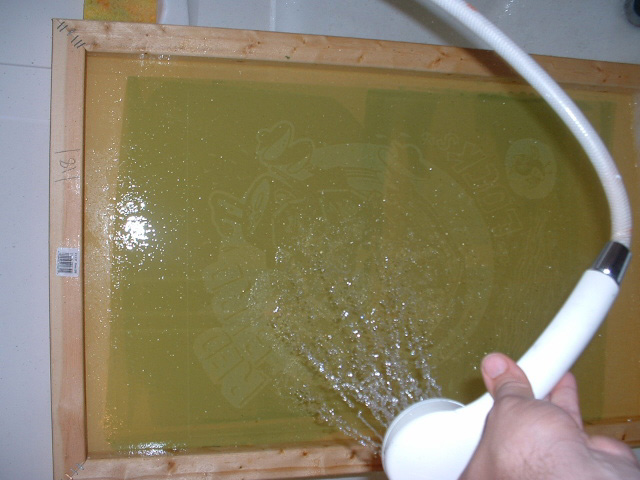 J) The only real specialty item in this step is the 250w photoflood lightbulb, which you can get from some hardware or art stores. You can definitely get them from dickblick.com. The cost is only $4 or $5. It is important to have that because it will only take 10 or 15 minutes to expose rather than an hour and a half with a regular bulb. The black paper beneath the screen helps absorb the stray light, and the glass holds your artwork flat to the screen (to eradicate little shadows beneath your art). It's nice to have that sheet of glass fit into the frame (smaller than the frame, but larger than your artwork), but if you don't have it, you can just use little pieces of clear tape to hold the acetate down. Okay, so what's happening here is this: the focused cone of light is hardening all the goo on the screen, except for the goo hidden beneath the opaque black areas of your artwork. The Speedball emulsion kit comes with a little chart telling you how long to expose your screen, and how high away from the screen the bulb should be. Total cost for step 4: $10 |