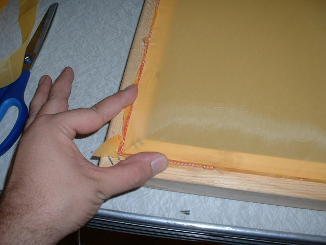 get better, etc. It's worth the effort I think! 1) THE SCREEN ITSELF: this is the wooden (or in hi-tech cases, lightweight metal) frame. My dad used to build these for me out of scrap wood, sometimes I've even used cheap picture frames. As long as it's flat (i.e. it lays flat on the table), and you can stretch silk on it, you can use it. Now, I build my own frames out of 1"x1"s from Home Depot. This is definitely the cheapest way to do it if you have access to a workshop, or at least a tablesaw. This is also nice cuz you can build frames to any size or shape you want. Here's what it looks like (FIG. A). I buy the 'silk' (it's not really silk, it's a synthetic polyfiliament mesh) by the yard. You can get it at nicer art stores or online (I use dickblick.com; they have a pretty nice supply of all kinds of screenprinting supplies at reasonable prices). I cut a piece a little larger than my screen size. Then I fasten the silk to the frame. I do this buy cutting a 1/4" groove into the 1x1's (again with the table saw), then use some thin rope to pinch and tighten up the silk (FIG. B & C) You can also just use staples to hold the silk to the frame, sort of like upholstery. Just make sure the silk is tight and even tightened across the frame. The downside of this is that it's harder to remove the silk from the frame later, if you need to. OKAY, having said all that, I would probably recommend just buying a PRE-FAB frame+silk combo to start out. You can basically just go into the art store and buy a readymade screen, in one of a few popular sizes. This is pretty much the way to go for a starter, especially if you don't have access to a workshop. Depending on the size (the bigger the prefab screen, the more expensive), it will cost between $15 and $25 bucks. Keep in mind that you can re-use this screen forever, but will probably only be able to use the silk maybe 3 or 4 times tops. In order to be able to re-use the screen, you'll need a bottle of chemicals called "Stencil Remover", which will clean out the silk later. A bottle of this stuff probably cost $10. Total cost for step 1: $30 |